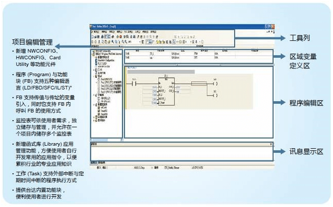 整合運動控制編輯:ISPSoft V3將邏輯編程與運動編程整合在同一套軟件上,并提供符合國際標準規格 PLCopen® 的功能塊以及臺達提供的豐富功能塊